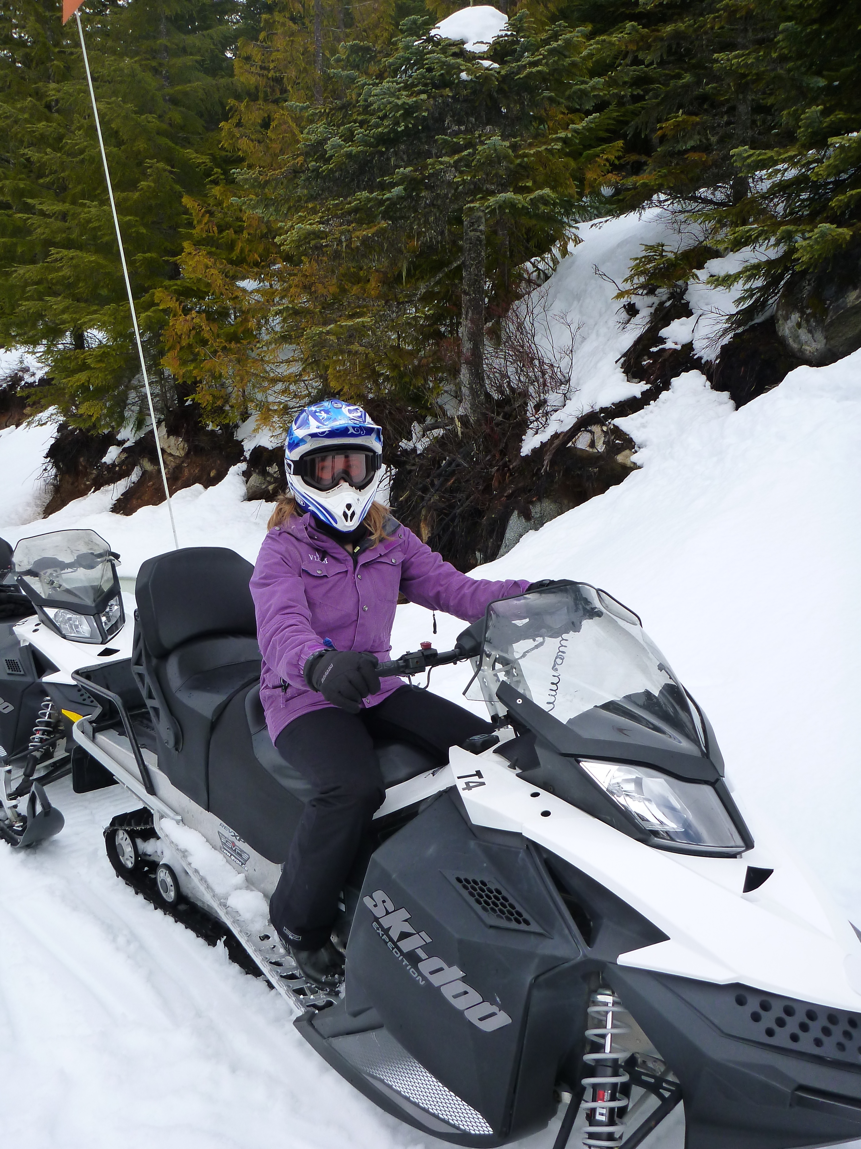 The verdict? Snowmobiling (or sledding, for those in the know) is actually really fun! Like jet-skiing, I had no problem taking control on the big, wide open lake that was covered in about a foot of fluffy, soft powder. That was awesome! The winding hills and sharp turns around trees and near cliffs — not so much. For those parts, I was happy to be on the back… though that wasn’t exactly smooth sailing either!